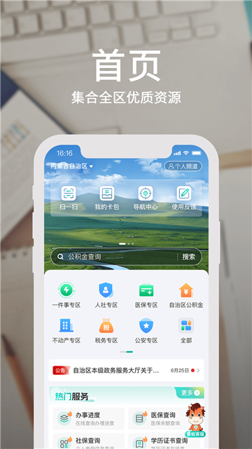 内蒙古蒙速办app是专为内蒙古市民朋友而打造的生活服务软件,主要由内蒙古自治区政务服务局推出,它提供政务服务、便民服务、本地资讯、政务新闻等综合服务,包含申请健康码水电费缴纳、公交实时查询、教育缴费、预约挂号等便民服务,让你在手机上轻松付费,快速预约线下医院,享受互联网的便捷。而且,软件涵盖了本地、国内、国际等分类新闻资讯,让用户随时阅读自己感兴趣的文章,更有公积金、社保、重名等查询服务,方便市民时刻了解自己的社保公积金状况。另外,内蒙古蒙速办app将各地的服务大厅整合到了一起,给你生活带来便利,并且无需排队等待,线上就能满足你的办事需求,有需要的用户欢迎下载体验。